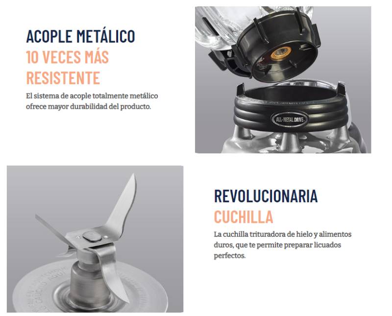 - Sistema de acople de metálico 10 veces más fuerte*** entre la cuchilla y el eje de la base que prolonga la vida de la licuadora.
