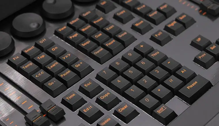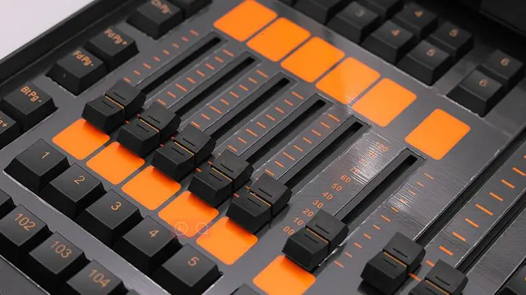 1 rueda de atenuación maestra, 4 ruedas de código de tabla de atributos, 1 fader maestro, 2 faders AB, 6 faders de reproducción de programa, 12 teclas de función de almacenamiento de programa